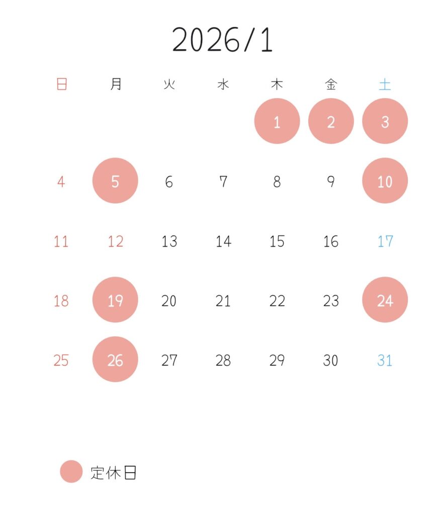 2025.12.26 1月の定休日について 2026年1月の定休日は以下の通りです。まだ日中との寒暖差が強い日もあり、来月も定期的なメンテナンスなどでお越しいただければ幸いです。1月もたくさんのご来院お待ちしております! 年末年始休業のお知らせ 前の記事